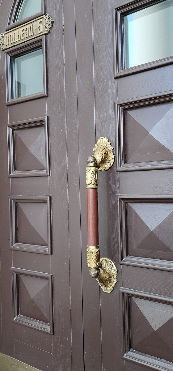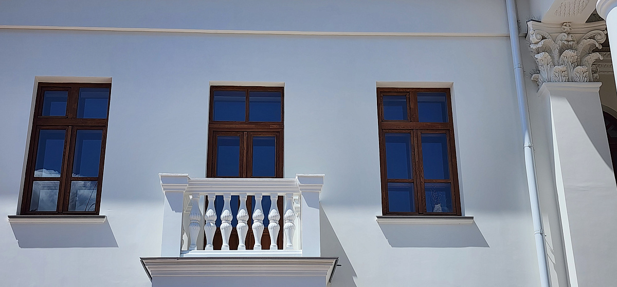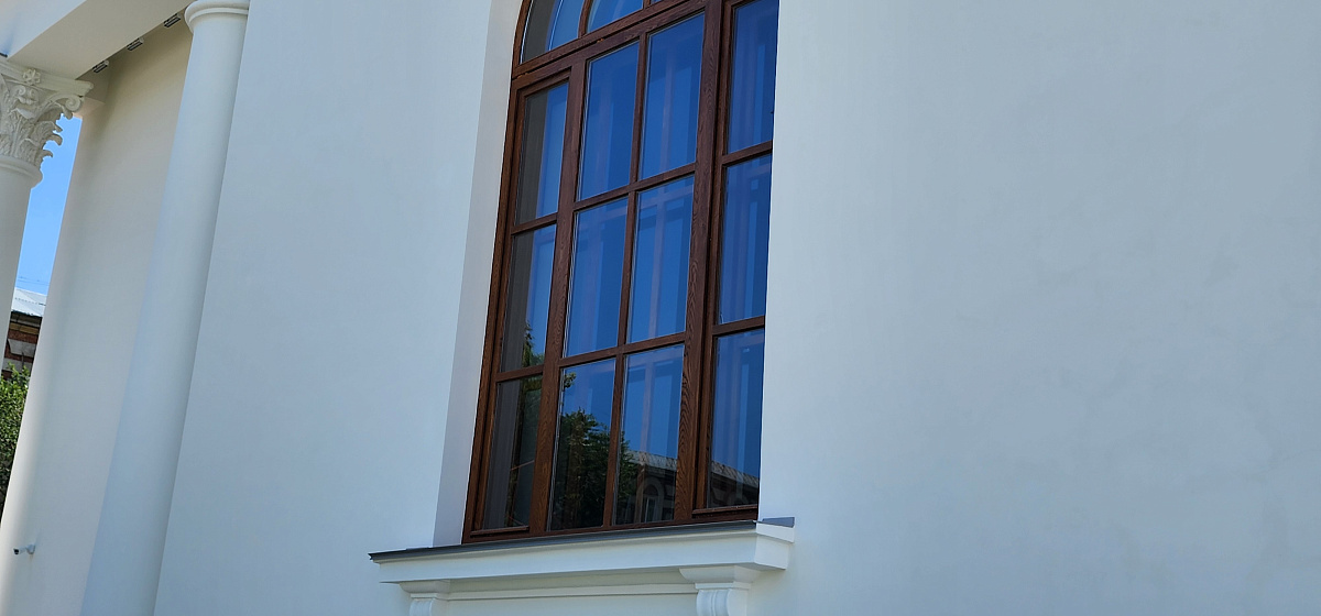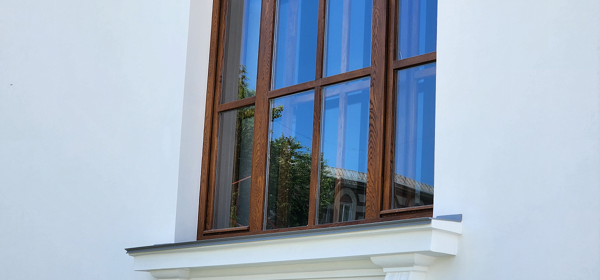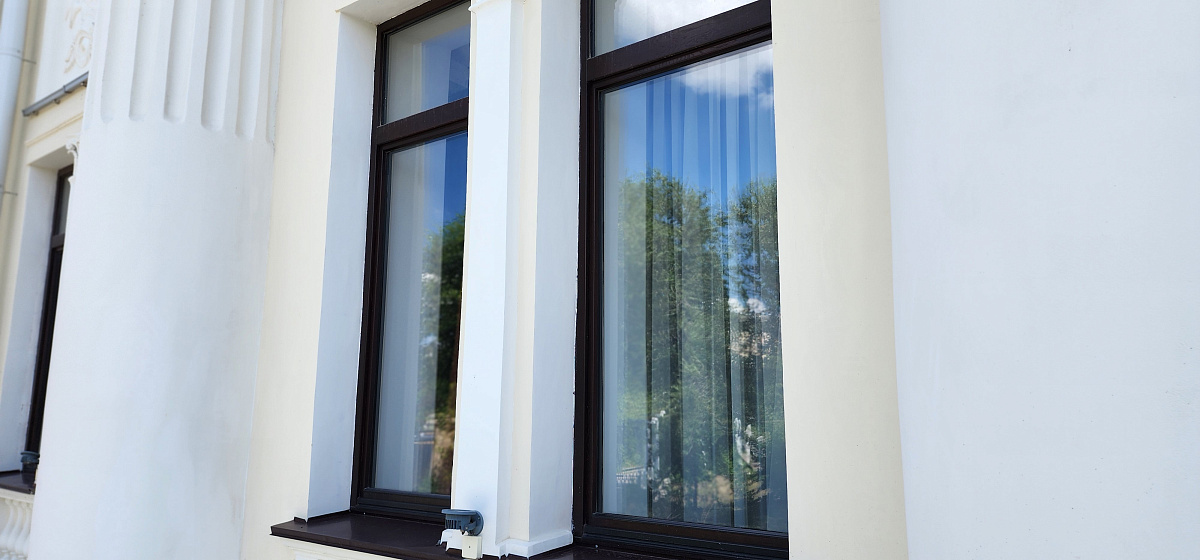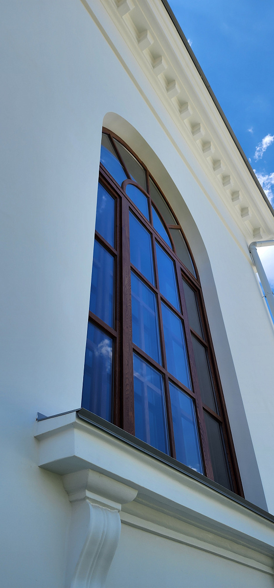 Воссоздание деревянных исторических окон из лиственницы в 2 нитки на единой коробке с латунной фурнитурой.